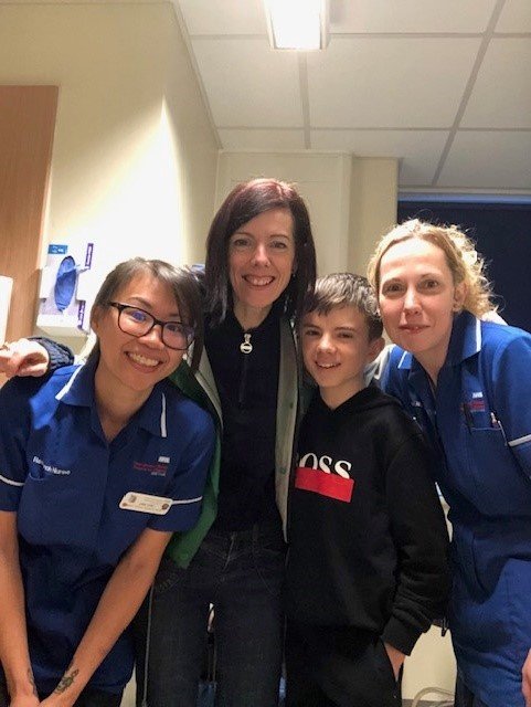 Austin and his Mum, Louise, with GOSH Research Nurses Jan Chu and Danielle Pinner at one of their recent yearly visits to the hospital post CAR T-cell treatment to donate samples to the study.