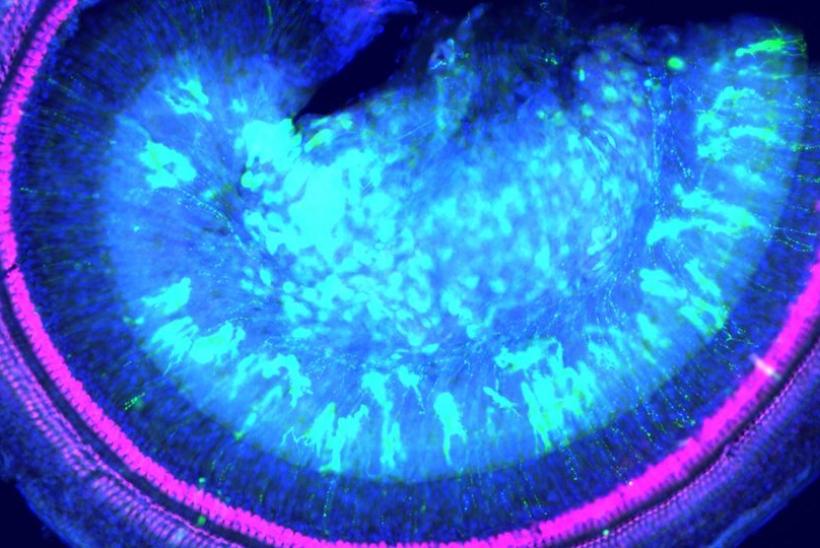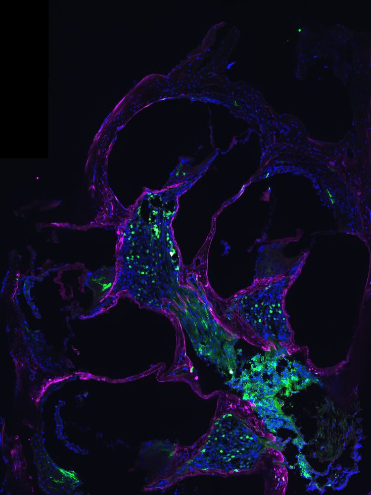 A slice through a cochlea after gene therapy (green) shows replaced norrin protein in pink / magenta.