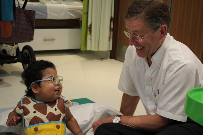 接下来,为治疗一种称为早产儿视网膜病变(ROP)的严重眼疾,奥马尔随后还接受了激光眼科手术。该手术挽救了他的视力。“奥马尔的眼睛有着很严重的问题。他曾在自己的国家就早产儿视网膜病变治疗过。但是在转诊来GOSH后,我们发现他的右眼开始出现牵引型视网膜脱离的现象。” 小儿眼科专家医师罗伯特.哈德森医生解释道。“我们为他做了一个内镜玻璃体切除手术来削减疤痕组织。如果不做这个手术,奥马尔很可能会失去右眼的视力。”